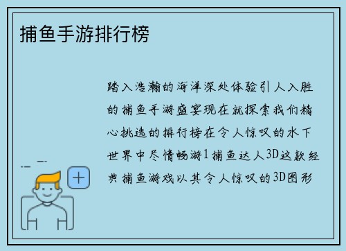 无论你是经验丰富的捕鱼狂人还是刚接触这项激动人心的游戏,我们的捕鱼手游排行榜都能满足你的需求。潜入深海,享受捕鱼的快感,成为海底世界的捕鱼王者!